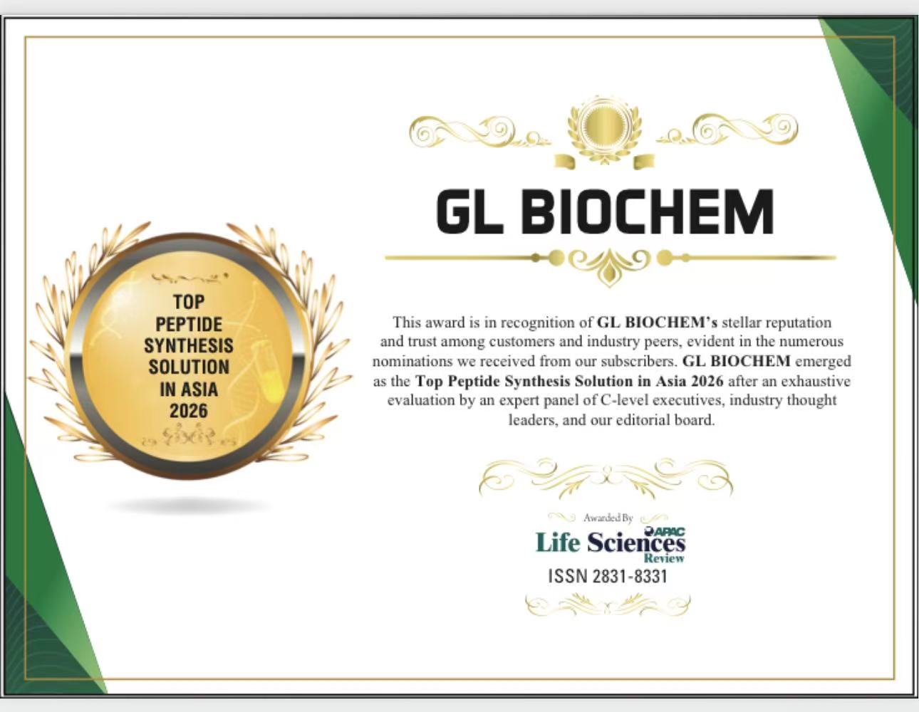 GL BIOCHEM was officially awarded the TOP PEPTIDE SYNTHESIS SOLUTION IN ASIA 2026 by Life Sciences Review (ISSN 2831-8331), a globally authoritative media outlet, in recognition of its profound technological expertise, unwavering commitment to quality and outstanding global service capabilities in the field of peptide synthesis.